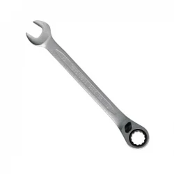 Rachetting combination spanner. Combined ring/open ended spanner and 12 point ring rachet with flip reverse. Same size at both ends, offset at a 13 degree angle chrome vanadium. Satin finish