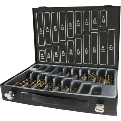 170 piece spiral drill magazine DIN 338 type N HSS-G each 10 pieces diameter 1.0 mm – 8.0 mm x 0.5 mm increments each 5 pieces diameter 8.5 mm – 10.0mm x 0.5mm rising in practical sheet steel case.